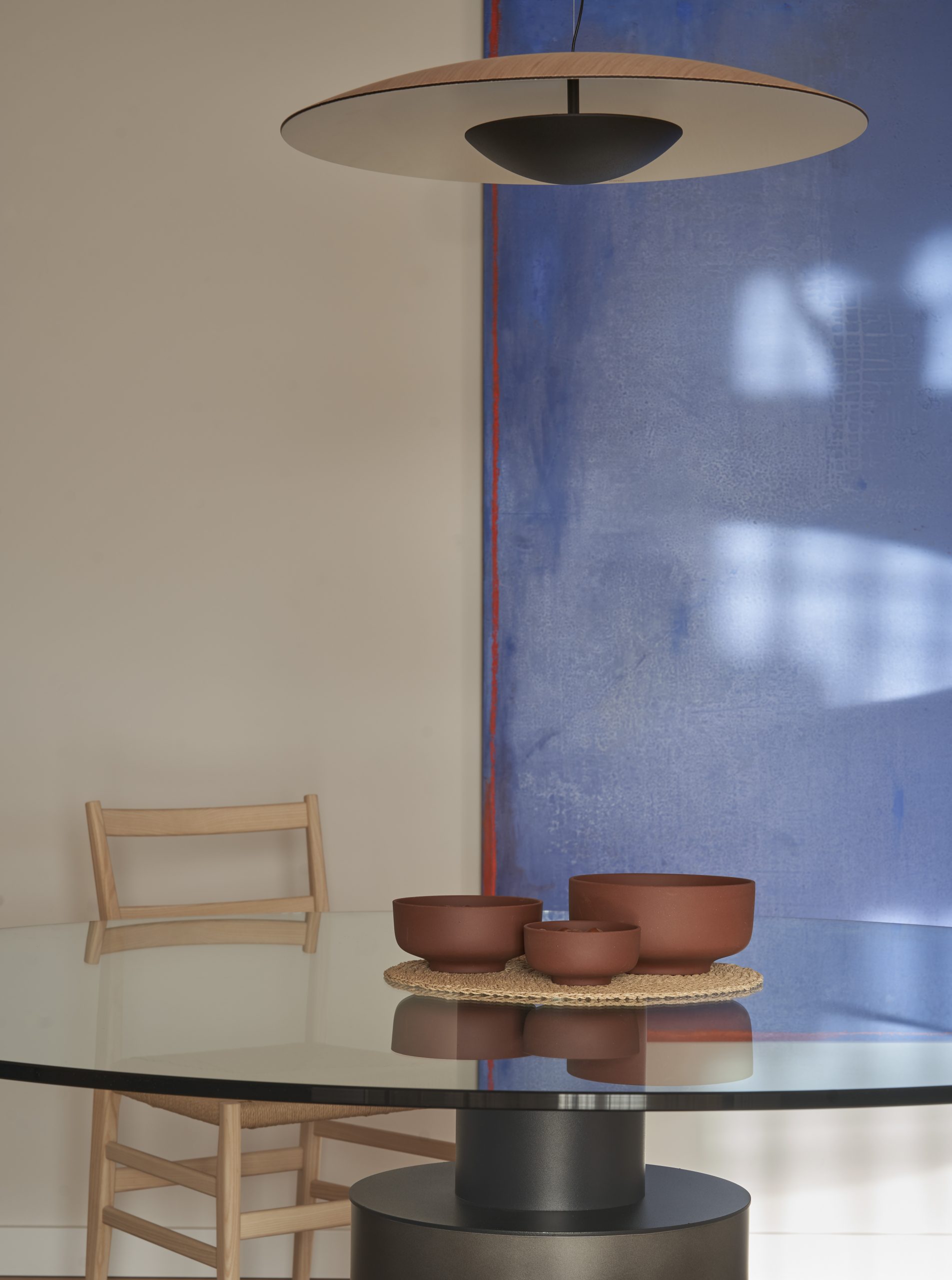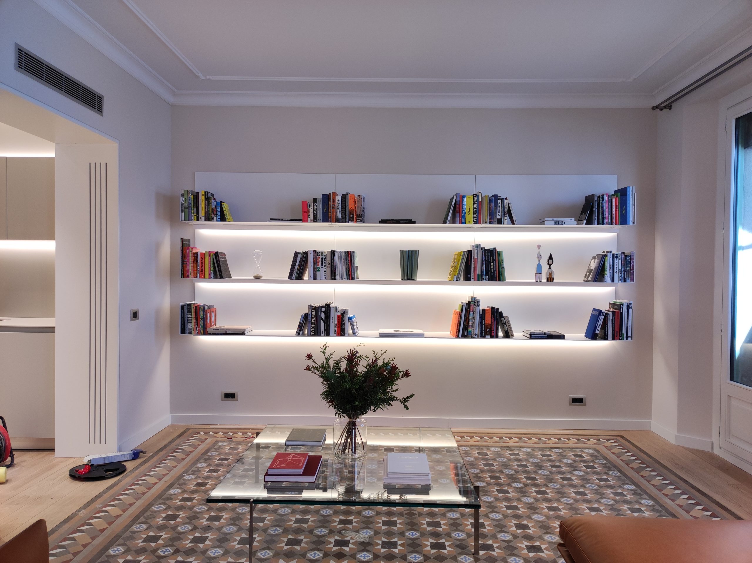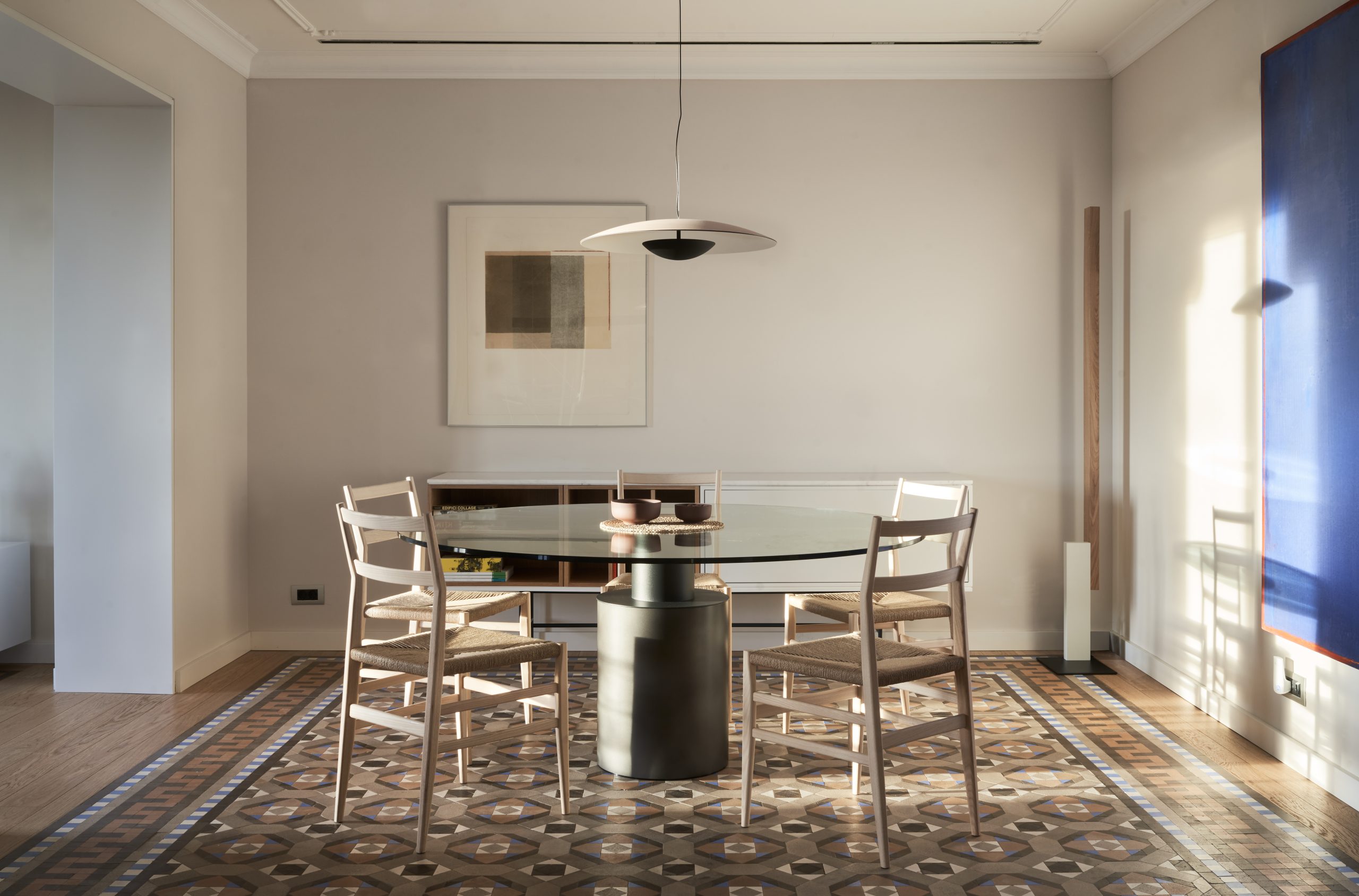 Para contrastar y realzar estos elementos únicos, el mobiliario ha sido cuidadosamente seleccionado y diseñado con líneas modernas y minimalistas. Destacan los muebles en chapa metálica, que parecen flotar en el espacio y aportan un toque ligero y etéreo, logrando un equilibrio perfecto entre lo nuevo y lo antiguo. Este mobiliario discreto y funcional permite que el protagonismo se mantenga en los detalles históricos del piso, resaltando la belleza y carácter que lo distinguen.